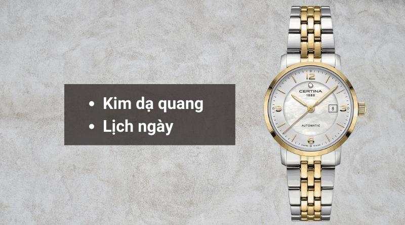 - Hãng Certina đã trang bị thêm tiện ích lịch ngày, kim dạ quang cho mẫu đồng hồ nữ này, giúp người đeo quản lý thời gian tốt hơn