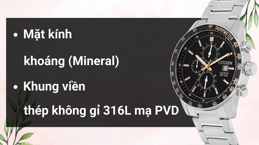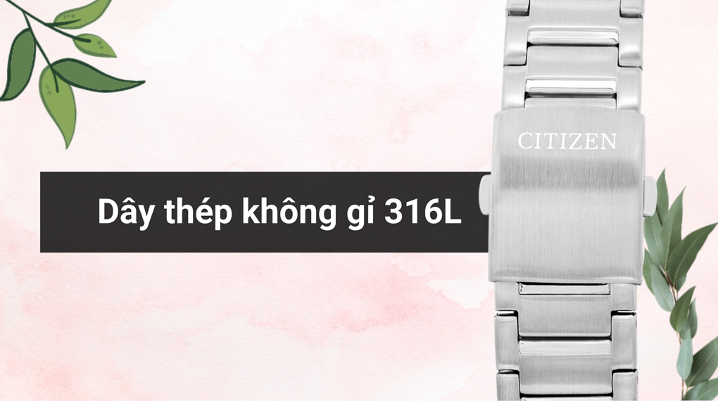 • Khung viền và dây đeo của đồng hồ Citizen này được làm bằng thép không gỉ 316L - một chất liệu vừa cứng cáp, bền bỉ vừa khả năng chống va đập tốt và hạn chế ăn mòn. Ngoài ra, khung viền còn được phủ lớp PVD tạo thêm vẻ bóng bẩy và đẳng cấp cho sản phẩm.