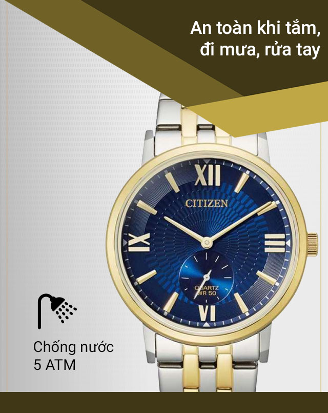 - Chống nước 5 ATM, không cần tháo đồng hồ ngay cả khi đi mưa, rửa tay hay tắm nhưng không nên đeo khi lặn hoặc bơi lội