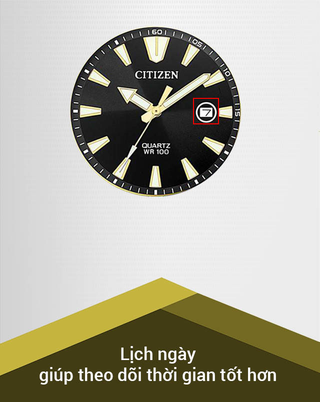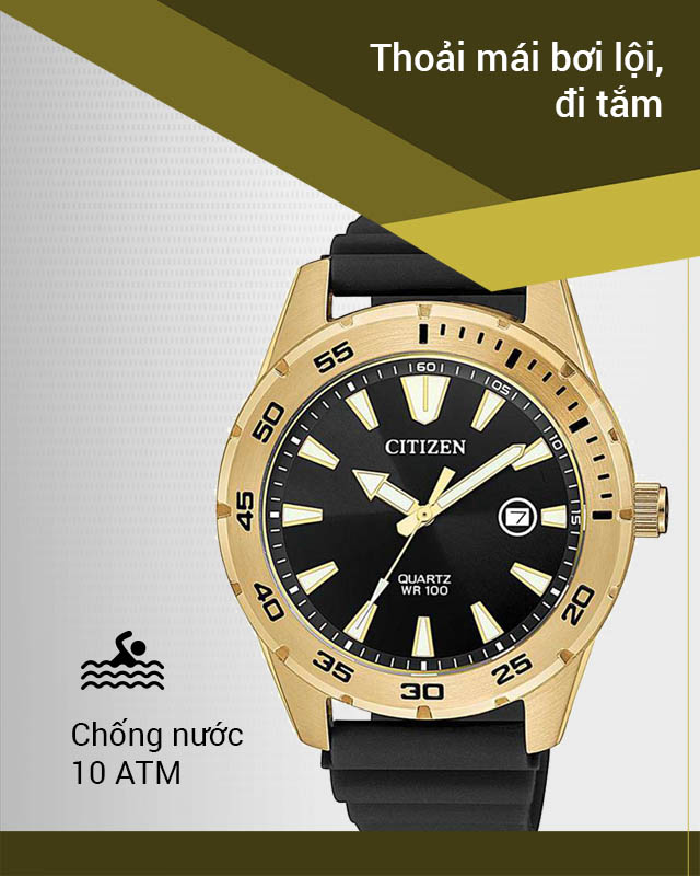 Hệ số chống nước 100 m, đeo được khi tắm, bơi, không mang đồng hồ Citizen nam khi lặn.