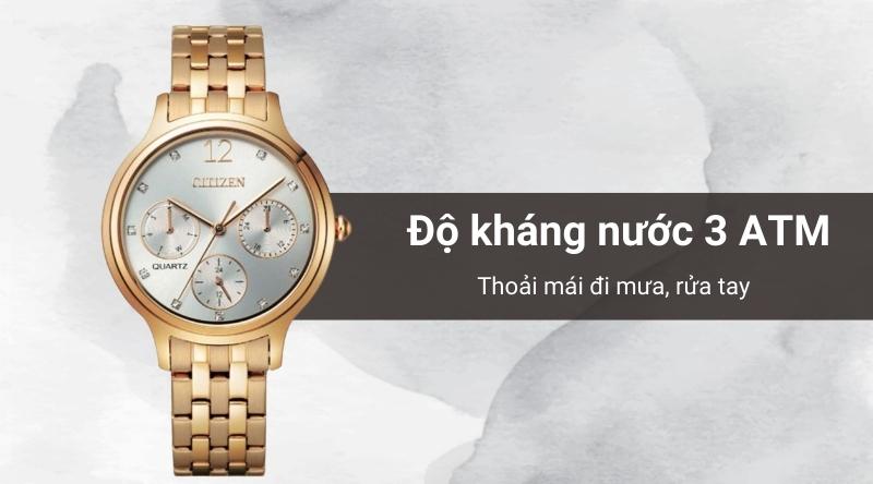 - Chống nước 3 ATM, không cần tháo đồng hồ ngay cả khi đi mưa nhỏ, rửa tay nhưng không nên đeo khi tắm, lặn hoặc bơi lội