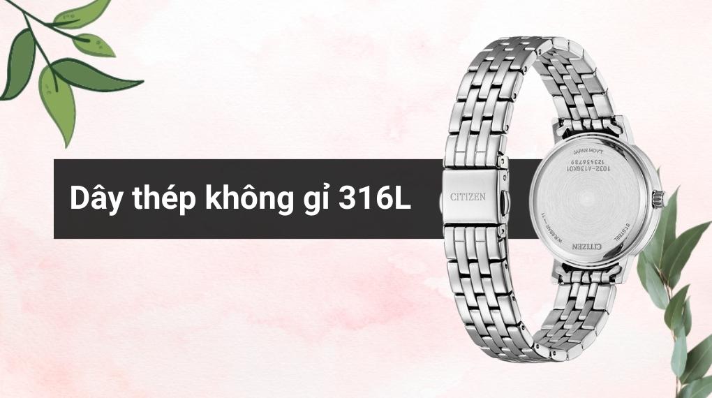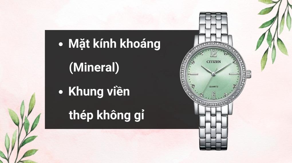 • Đồng hồ Citizen này có kích thước mặt 31 mm, phù hợp cho các bạn nữ cổ tay vừa. Chất liệu kính khoáng được sử dụng cho mặt đồng hồ, cung cấp khả năng chống trầy xước và ít nứt vỡ khi bị va đập.