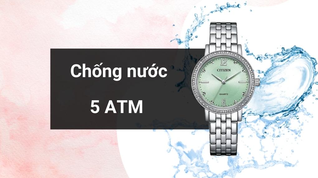 • Điểm mạnh khác của đồng hồ nữ này là khả năng chống nước lên đến 5 ATM, cho phép bạn sử dụng thoải mái trong các hoạt động hàng ngày như rửa tay hoặc đi tắm. Tuy nhiên, hãy tránh đeo nó khi bạn tham gia vào các hoạt động bơi lội hoặc lặn.