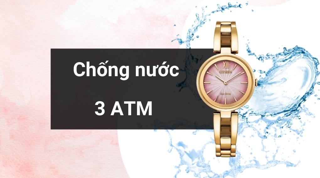 • Hệ số kháng nước của sản phẩm là 3 ATM, cho phép bạn sử dụng đồng hồ nữ hàng ngày, bao gồm rửa tay, đi mưa nhỏ. Tuy nhiên, lưu ý không đeo đồng hồ khi tắm, bơi, lặn.