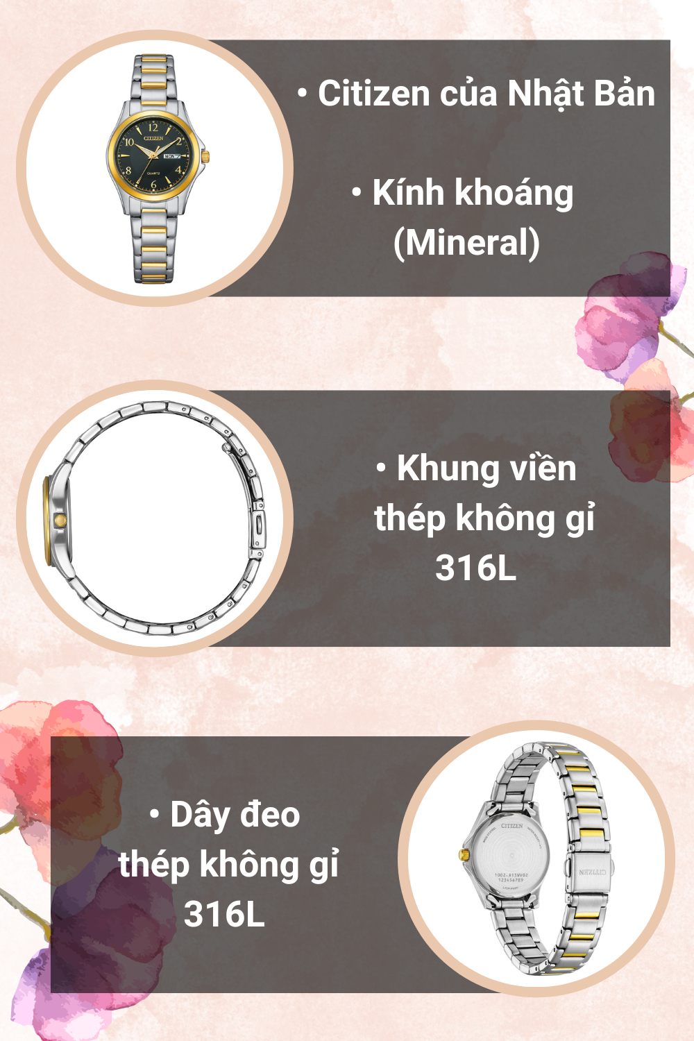 • Đường kính mặt của mẫu đồng hồ CITIZEN 28 mm Nữ EQ0614-52E này là 28 mm, độ rộng dây là 14 mm.