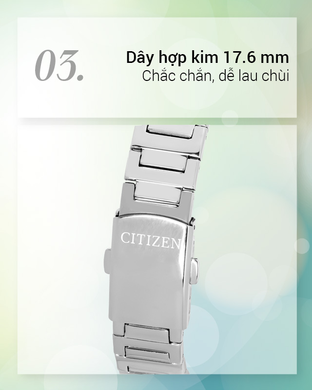 Dây đồng hồ Citizen nữ bền bỉ, dễ lau chùi khi bám bụi bẩn, chắc chắn, chịu được mọi điều kiện thời tiết khắc nghiệt.