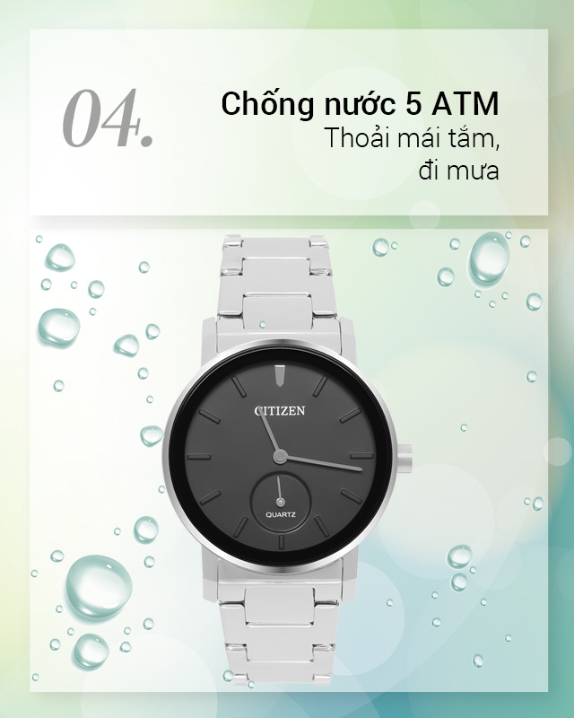 Hệ số chống nước 5 ATM giúp chiếc đồng hồ hoạt động bình thường khi tắm, rửa tay và đi mưa. Không nên đeo đồng hồ khi bạn tham gia bơi lội.
