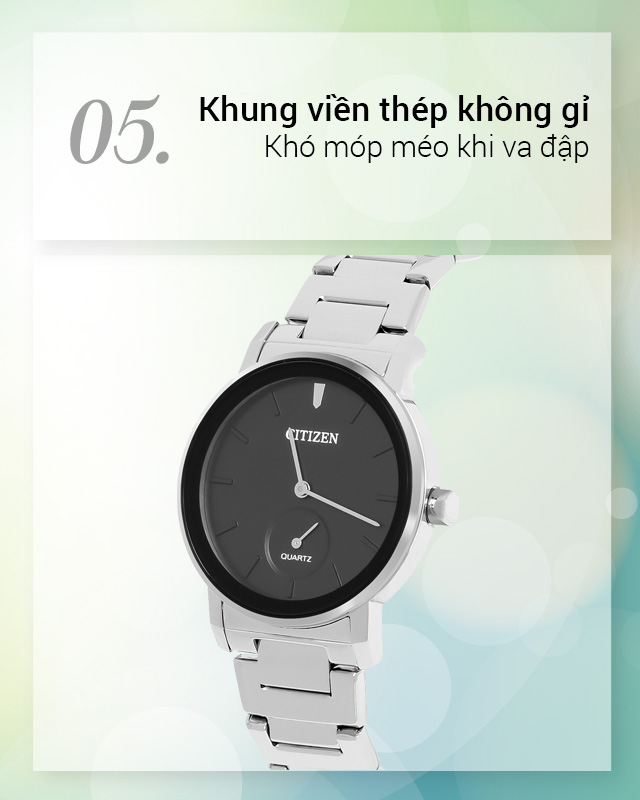 - Khung viền chiếc đồng hồ nữ chịu va đập tốt, chắc chắn, sáng bóng nhờ khả năng chống oxi hóa và ăn mòn tốt.