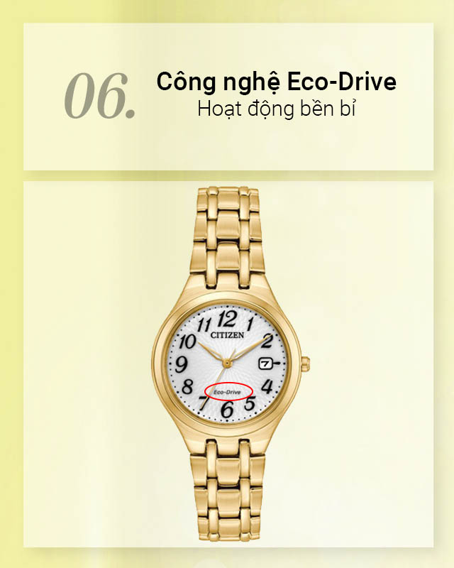 Đồng hồ sử dụng công nghệ Eco-Drive hoạt động nhờ nguồn năng lượng được chuyển hóa từ ánh sáng (mặt trời, đèn,...).
