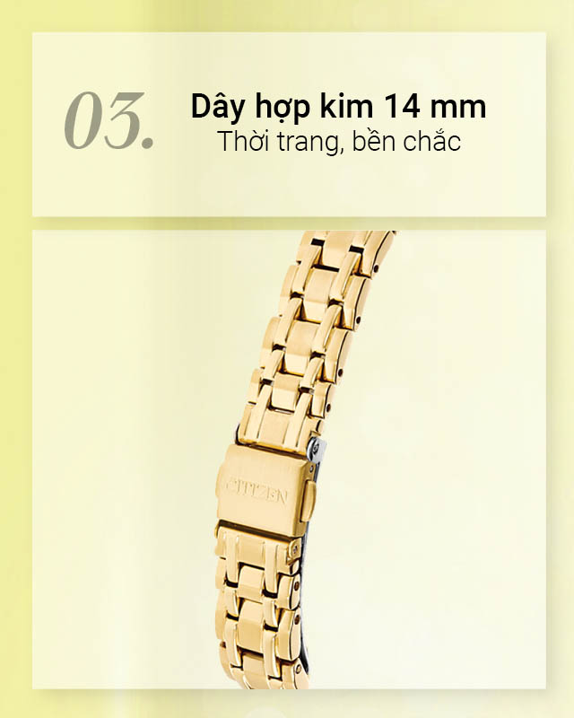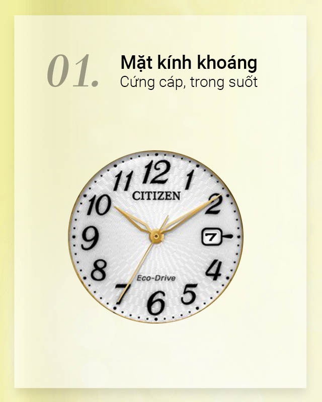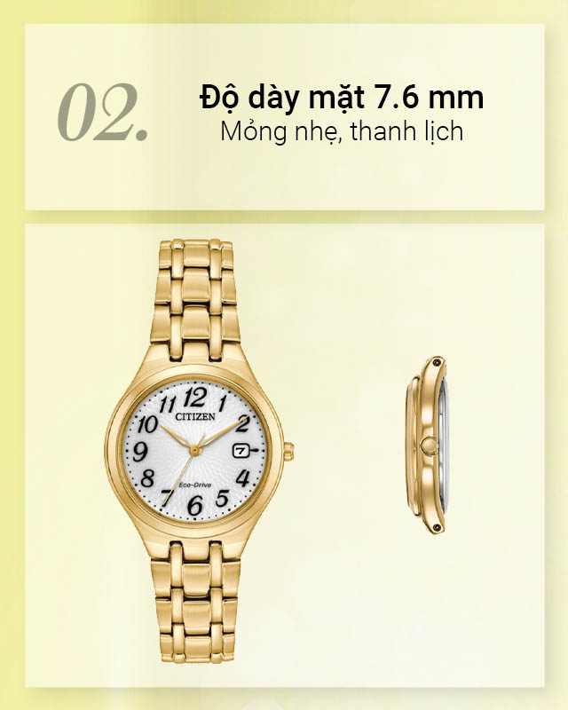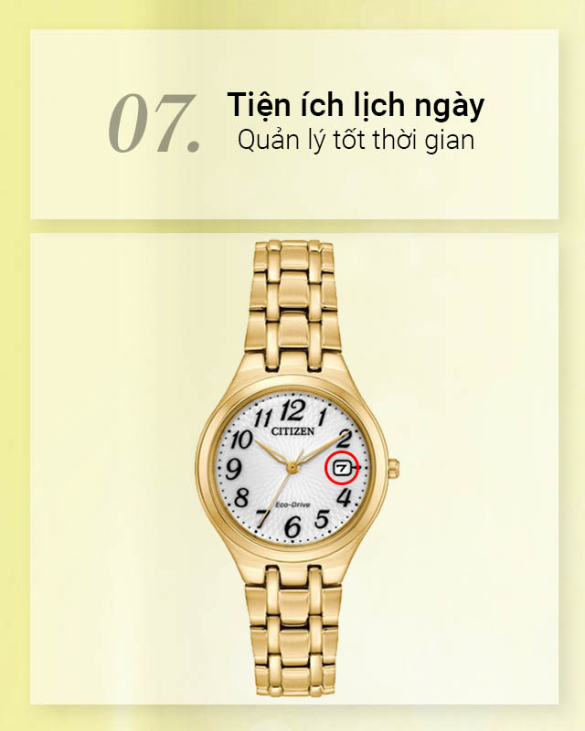 Ô lịch ngày ở vị trí 3 giờ trên đồng hồ Citizen nữ, với con số to, rõ ràng giúp bạn dễ dàng theo dõi các ngày trong tháng.
