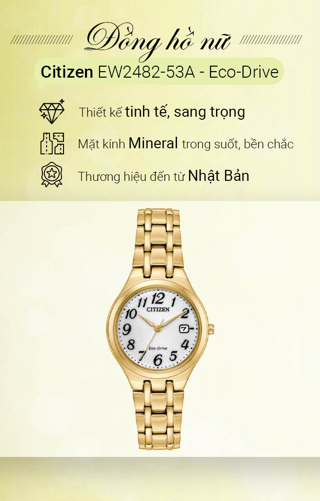 Đồng hồ nữ Citizen EW2482-53A đến từ thương hiệu Citizen của Nhật Bản, nổi tiếng với những chiếc đồng hồ cao cấp.