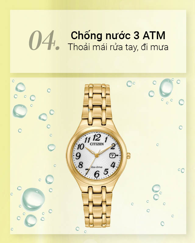 Nhờ khả năng chống nước 3 ATM, chiếc đồng hồ nữ hoạt động bình thường khi rửa tay và đi mưa, không đeo đồng hồ khi đi tắm.