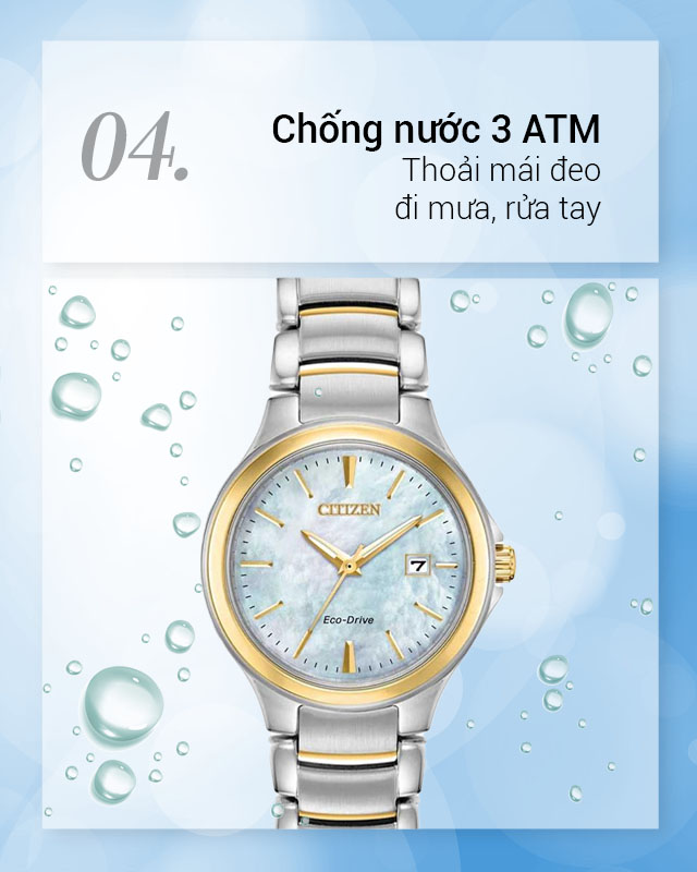 Đồng hồ đeo được khi đi mưa, rửa tay với độ chống nước 3 ATM. Không đeo khi tắm, bơi lội
