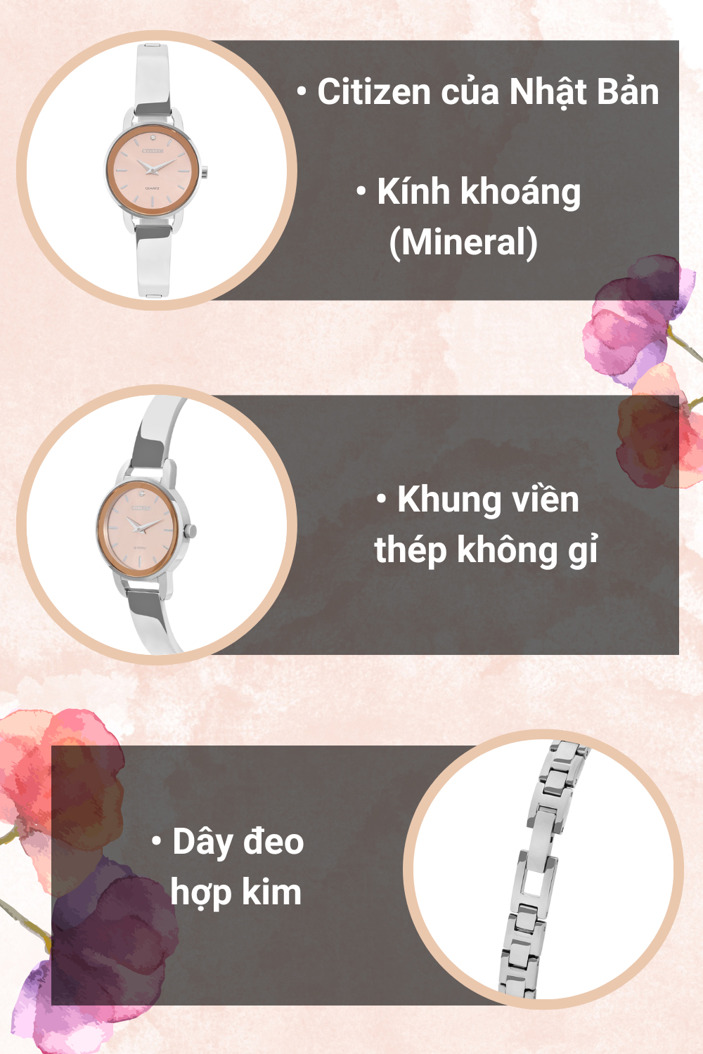Dây đeo của chiếc đồng hồ Citizen nữ bền bỉ, chắc chắn, mang đến cảm giác mát tay cho người dùng khi đeo