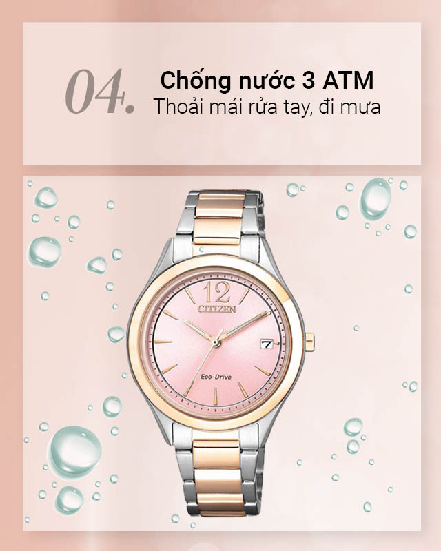 Khả năng chống nước 3 ATM giúp chiếc đồng hồ nữ hoạt động bình thường khi rửa tay và đi mưa, không đeo đồng hồ khi đi tắm.