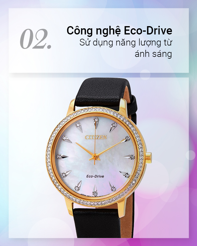 Được tích hợp công nghệ Eco-Drive hiện đại, hoạt động bằng nguồn năng lượng được chuyển hóa từ ánh sáng (mặt trời, đèn, ...)