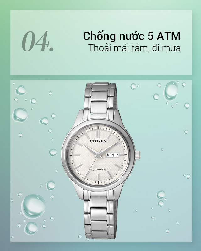 Chống nước 5 ATM, có thể đeo đồng hồ khi đi mưa, tắm rửa. Không nên đeo đồng hồ khi bơi, lặn.
