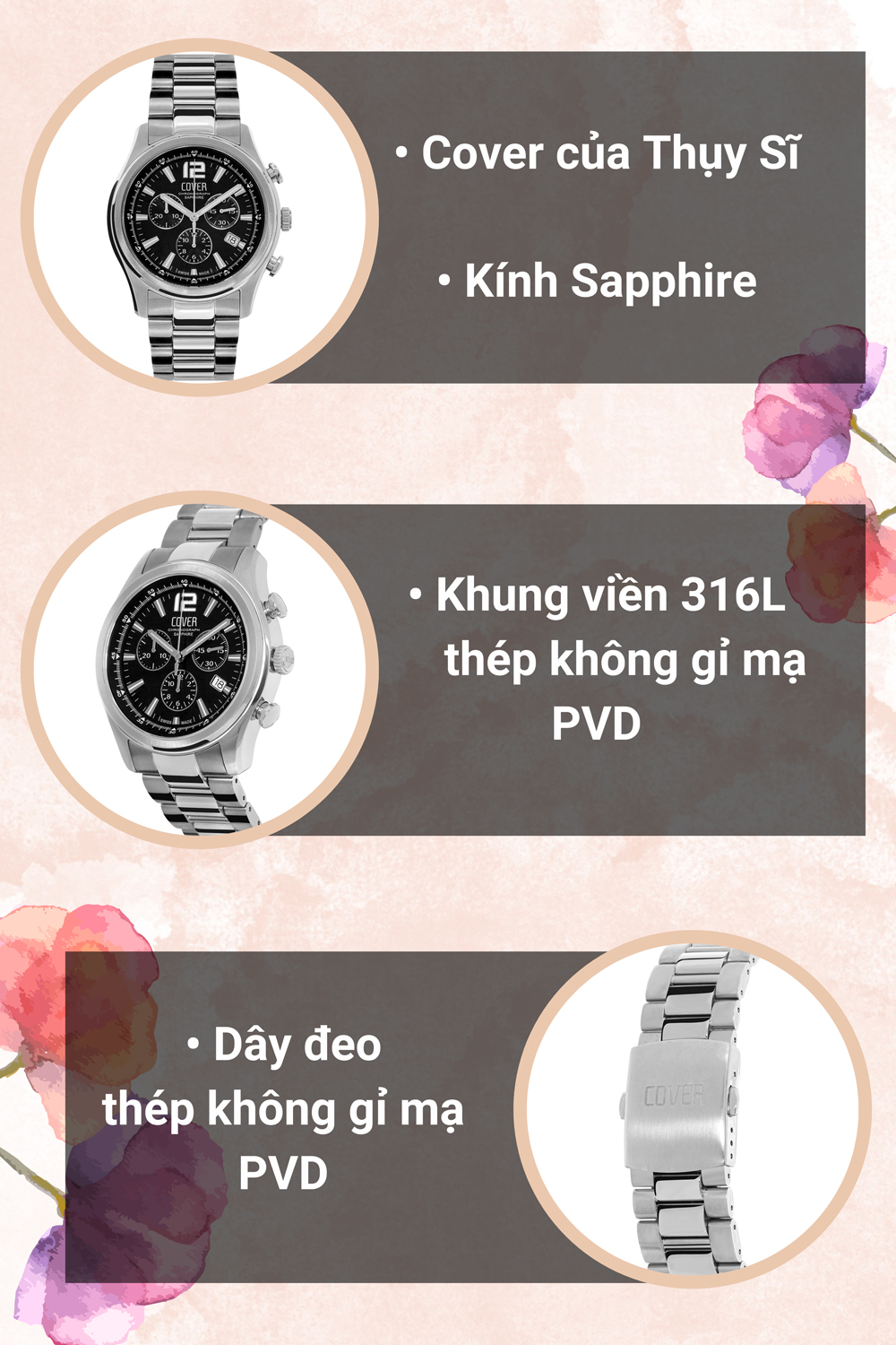 - Cover có sự đa dạng về phong cách, mỗi chiếc đồng hồ từ cổ điển, thanh lịch cho đến mạnh mẽ, thể thao, đều được chú trọng về kiểu dáng và chất liệu. Hơn 30 năm qua, đồng hồ Cover đã khẳng định được vị thế của mình trong ngành sản xuất đồng hồ, trở thành thương hiệu đồng hồ thời trang cao cấp, uy tín và đã có mặt ở hơn 40 quốc gia trên Thế giới.