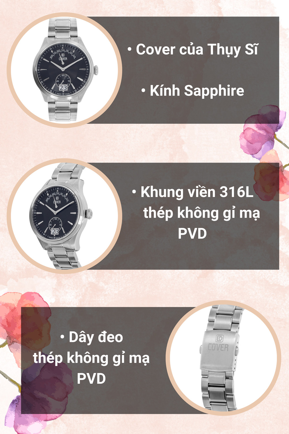 - Cover có sự đa dạng về phong cách, mỗi chiếc đồng hồ từ cổ điển, thanh lịch cho đến mạnh mẽ, thể thao, đều được chú trọng về kiểu dáng và chất liệu. Hơn 30 năm qua, đồng hồ Cover đã khẳng định được vị thế của mình trong ngành sản xuất đồng hồ, trở thành thương hiệu đồng hồ thời trang cao cấp, uy tín và đã có mặt ở hơn 40 quốc gia trên Thế giới.