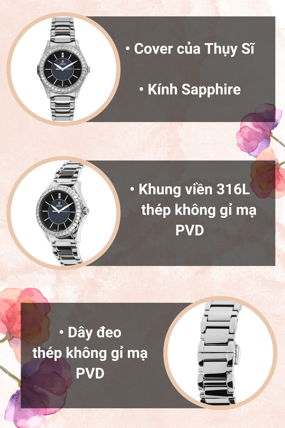 • Khung viền của sản phẩm được chế tạo từ thép không gỉ 316L mạ PVD, sự kết hợp hoàn hảo giữa tính năng chống ăn mòn và khả năng chống trầy xước. Điều này mang lại sự yên tâm tuyệt đối khi bạn đeo nó. Bên cạnh đó, phần dây đeo cũng được làm từ chất liệu thép không gỉ mạ PVD, giúp đồng hồ trở nên bền bỉ và lấp lánh, mang đến cho bạn sự an tâm khi đeo. Với thương hiệu Cover, bạn không chỉ sở hữu một món trang sức sang trọng, mà còn là một sự kết hợp hoàn hảo giữa vẻ đẹp và độ bền.