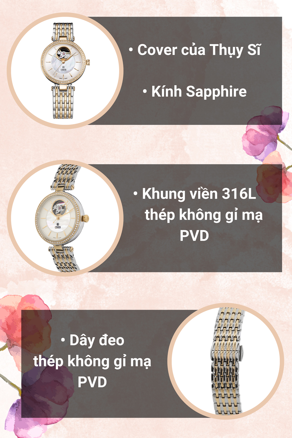 • Với đường kính 35 mm, đồng hồ Cover này tạo nên sự phù hợp và tương xứng hoàn hảo cho các bạn nữ với cổ tay trung bình đến lớn. Kích thước này không chỉ mang lại sự hài hòa và cân đối trên cổ tay của bạn, mà còn tạo nên một vẻ đẹp tinh tế và thu hút. Hãng đã áp dụng công nghệ kính Sapphire cao cấp cho mặt kính, mang đến khả năng chống trầy xước và bảo vệ vượt trội trước những va chạm thông thường. Điều này đảm bảo rằng đồng hồ của bạn có thể giữ được vẻ đẹp hoàn mỹ và độ sáng bóng suốt thời gian dài sử dụng.