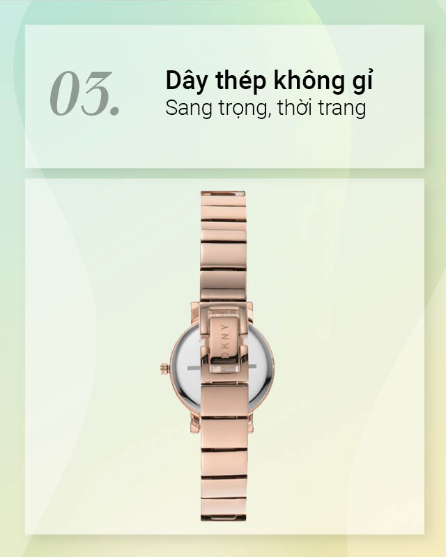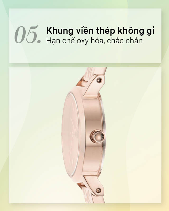 - Khung viền đồng hồ nữ và dây đeo được chế tác từ thép không gỉ cho độ bền cao, chống ăn mòn dưới điều kiện thời tiết khắc nghiệt