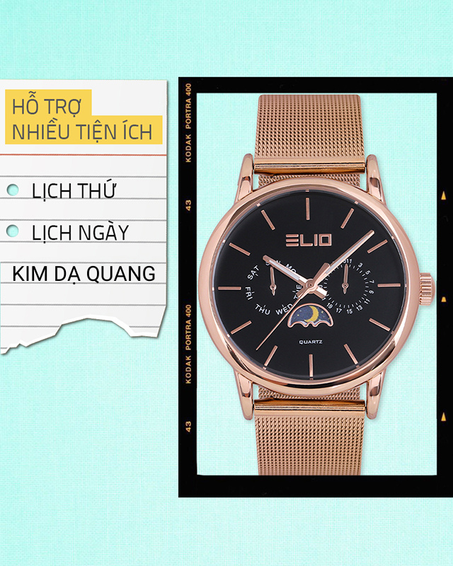 - Đồng hồ Elio với kiểu dáng, mẫu mã năng động, trẻ trung phù hợp với mọi lứa tuổi, đồng thời đồng hồ Elio còn mang vẻ đẹp sang trọng, lịch lãm. Đặc biệt đồng hồ Elio còn sử dụng bộ máy của Nhật Bản với chất lượng và độ bền cao.