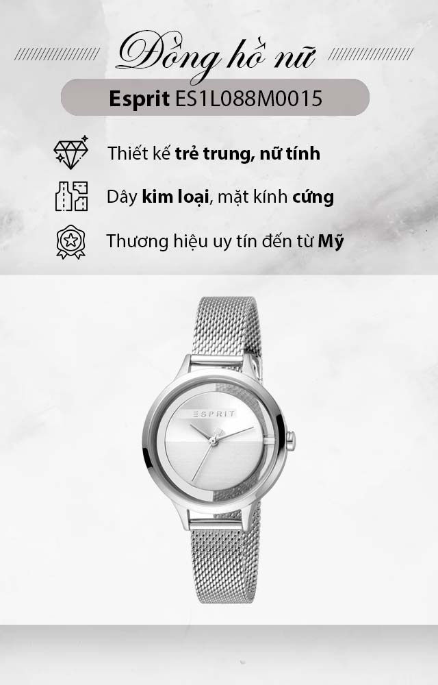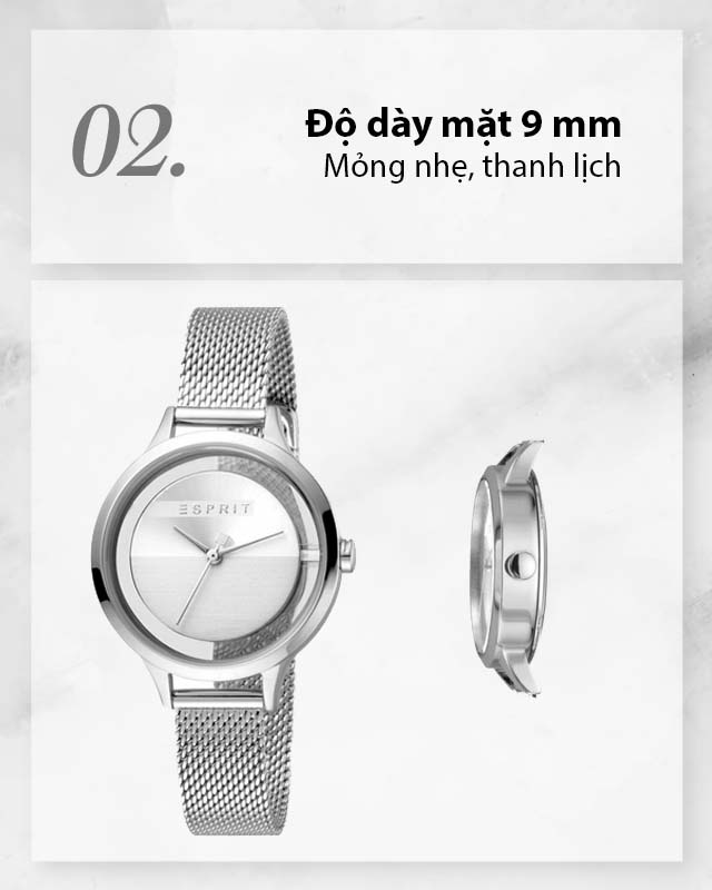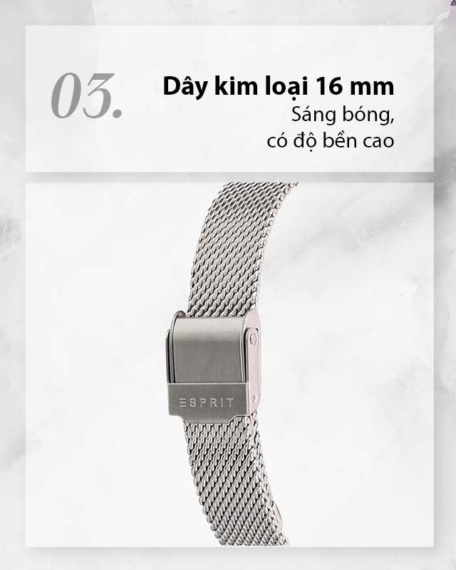- Thiết kế trẻ trung, nữ tính, là sản phẩm đến từ xứ sở cờ hoa thuộc hãng đồng hồ Esprit (Mỹ)