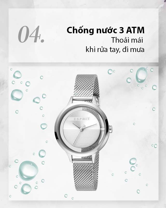 - Chẳng ngại làm hư đồng hồ khi đeo dưới trời mưa nhỏ và rửa tay với hệ số chống nước là 3 ATM nhưng nên hạn chế sử dụng trong lúc tắm, bơi và lặn