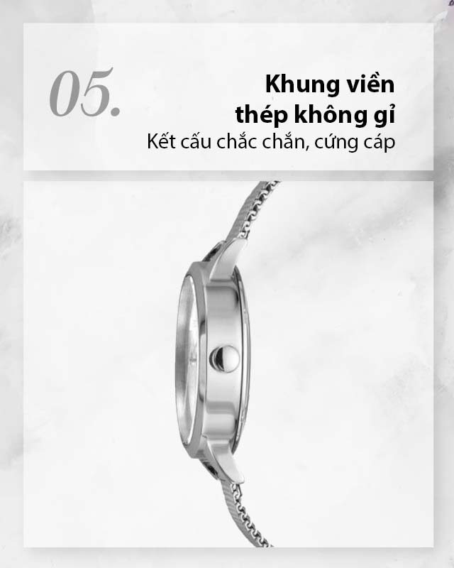 - Khung viền làm từ thép không gỉ chịu lực tốt, bảo vệ đồng hồ trước những va đập thông thường. Dây kim loại sáng bóng, có độ dày vừa phải nên rất phù hợp cho mục đích sử dụng hàng ngày
