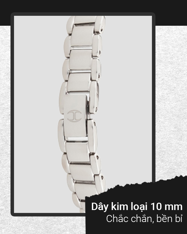 - Dây đồng hồ và khung viền làm từ kim loại sáng bóng đem đến sự bền bỉ, cứng chắc, bảo vệ an toàn các chi tiết bên trong