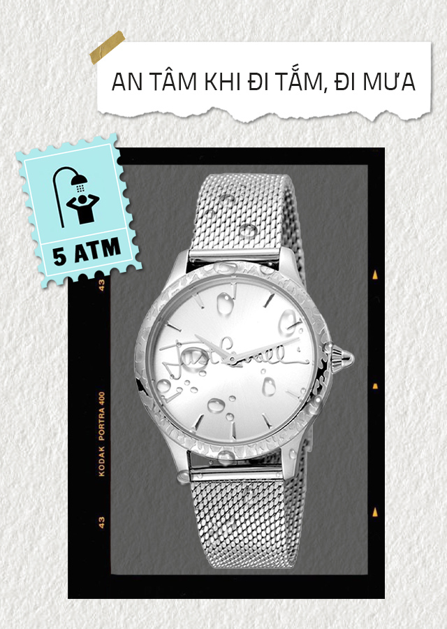 - Hệ số chống nước 5 ATM: Người dùng thoải mái đeo đồng hồ khi tắm, đi mưa mà không lo vào nước, không mang khi bơi, lặn