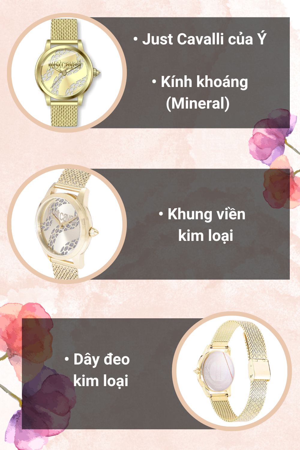 - Đồng hồ Just Cavalli là dòng sản phẩm phổ biến hơn với giá cả phải chăng, hướng đến đối tượng khách hàng có mức thu nhập tầm trung. Được thiết kế tỉ mỉ, mang nhiều phong cách khác nhau như: nữ tính, mềm mại, ngọt ngào, trẻ trung,... nâng tầm giá trị, định hình phong cách cho người đeo.