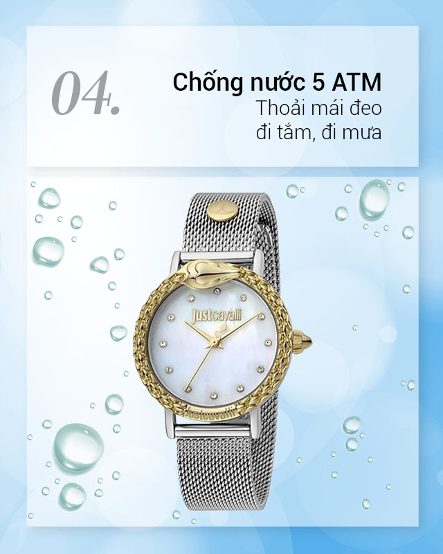- Độ chống nước 5 ATM cho phép bạn thoải mái đeo đồng hồ khi tắm, đi mưa hay rửa tay, không mang khi bơi, lặn