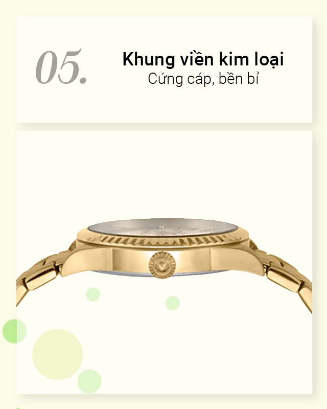 - Khung viền và dây đeo đều có chung chất liệu là kim loại cho độ bền cao, bảo vệ đồng hồ trước các tác động của thời tiết và dễ dàng lau chùi cũng như vệ sinh khi bám bẩn