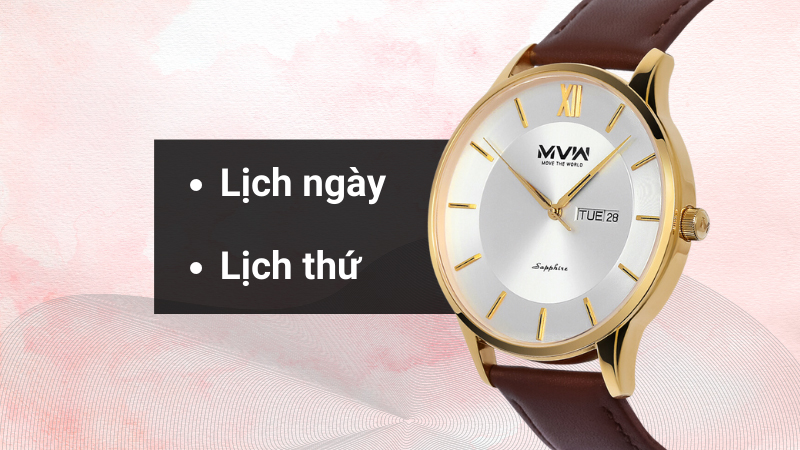 - Đồng hồ MVW được trang bị lịch thứ và lịch ngày ngay trên mặt đồng hồ giúp bạn theo dõi thời gian tiện lợi hơn.