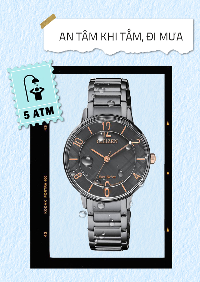 Độ chống nước 5 ATM, an toàn khi đi mưa, rửa tay, tắm. Không đeo đồng hồ khi bơi, lặn để tránh bị vô nước