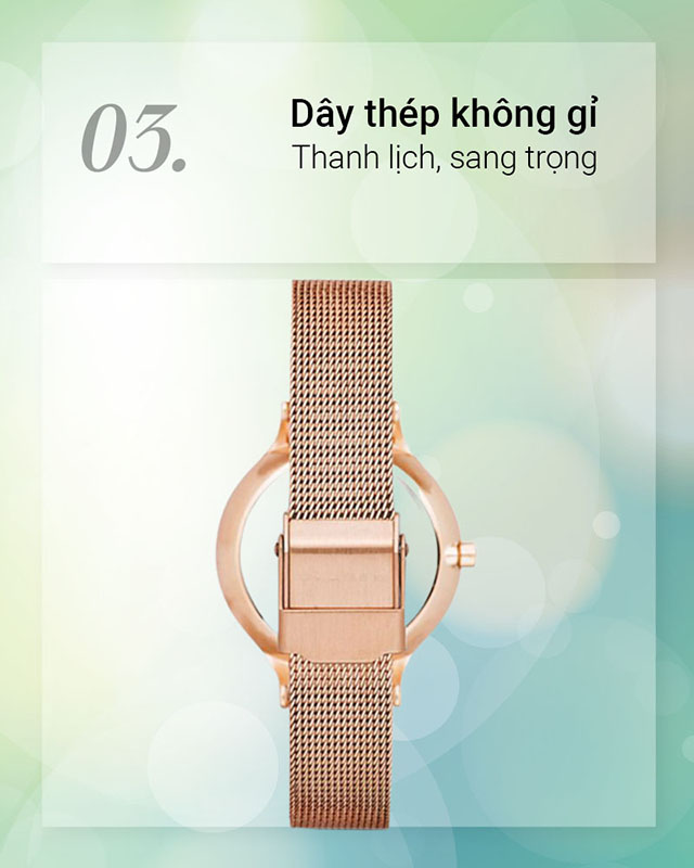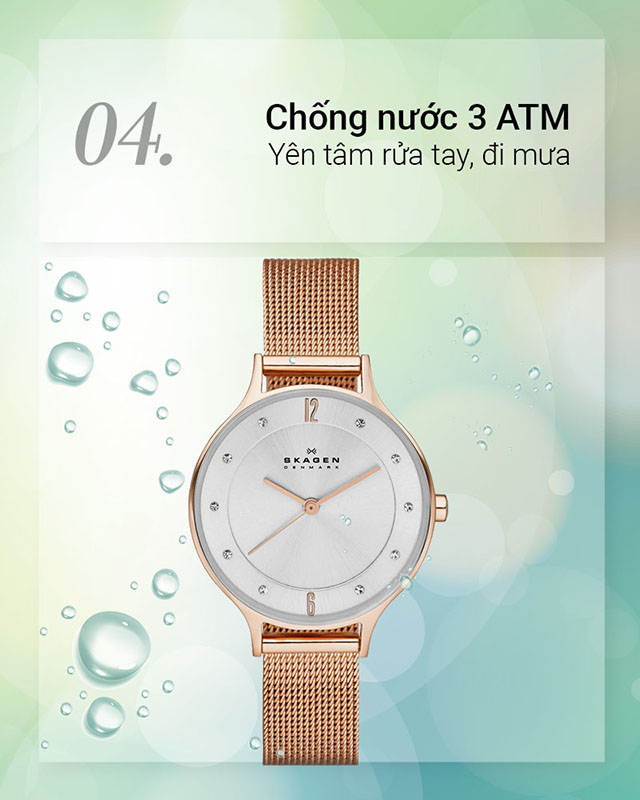 - Bạn có thể yên tâm đeo chiếc đồng hồ nữ này khi đi mưa hoặc rửa tay nhờ hệ số chống nước 3 ATM, không nên mang đi tắm, bơi hoặc lặn