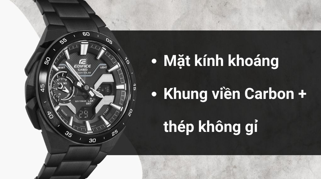 • Sự tinh tế của chiếc đồng hồ EDIFICE CASIO này thể hiện qua sự kết hợp hoàn hảo giữa công nghệ, thiết kế đẹp mắt và tính năng độc đáo. Thiết kế ngoại hình của nó được chia thành hai khu vực với nhiều chức năng khác nhau, và tên thương hiệu được in chìm tinh tế ở vị trí 12 giờ, tạo nên một sự thu hút sâu sắc.