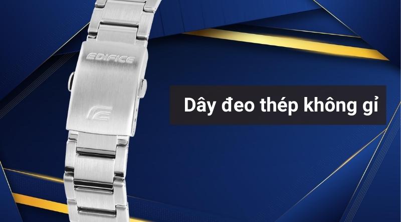 - Chất liệu của khung viền và dây đeo đều được làm từ thép không gỉ cứng cáp, bền bỉ với thời gian. Chất liệu này giúp đồng hồ dễ dàng lau chùi, luôn giữ được vẻ sáng bóng.