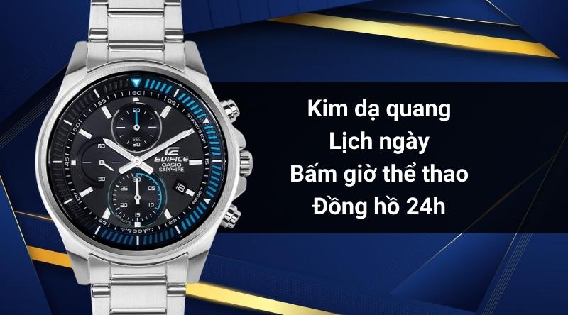 - Đồng hồ hỗ trợ bấm giờ thể thao, đồng hồ 24h, lịch ngày và kim dạ quang giúp người dùng thuận tiện theo dõi thời gian.