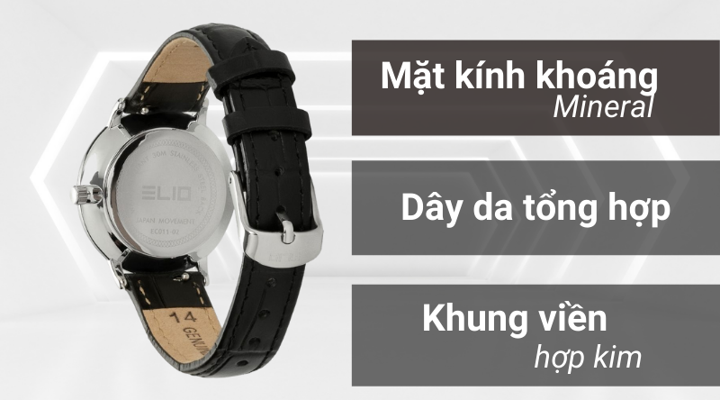 - Dây đeo đồng hồ ELIO EC011-02 được làm từ chất liệu da êm ái, nhẹ nhàng có khóa cài chống gỉ đem đến sự thoải mái, dễ chịu khi đeo cả ngày dài.