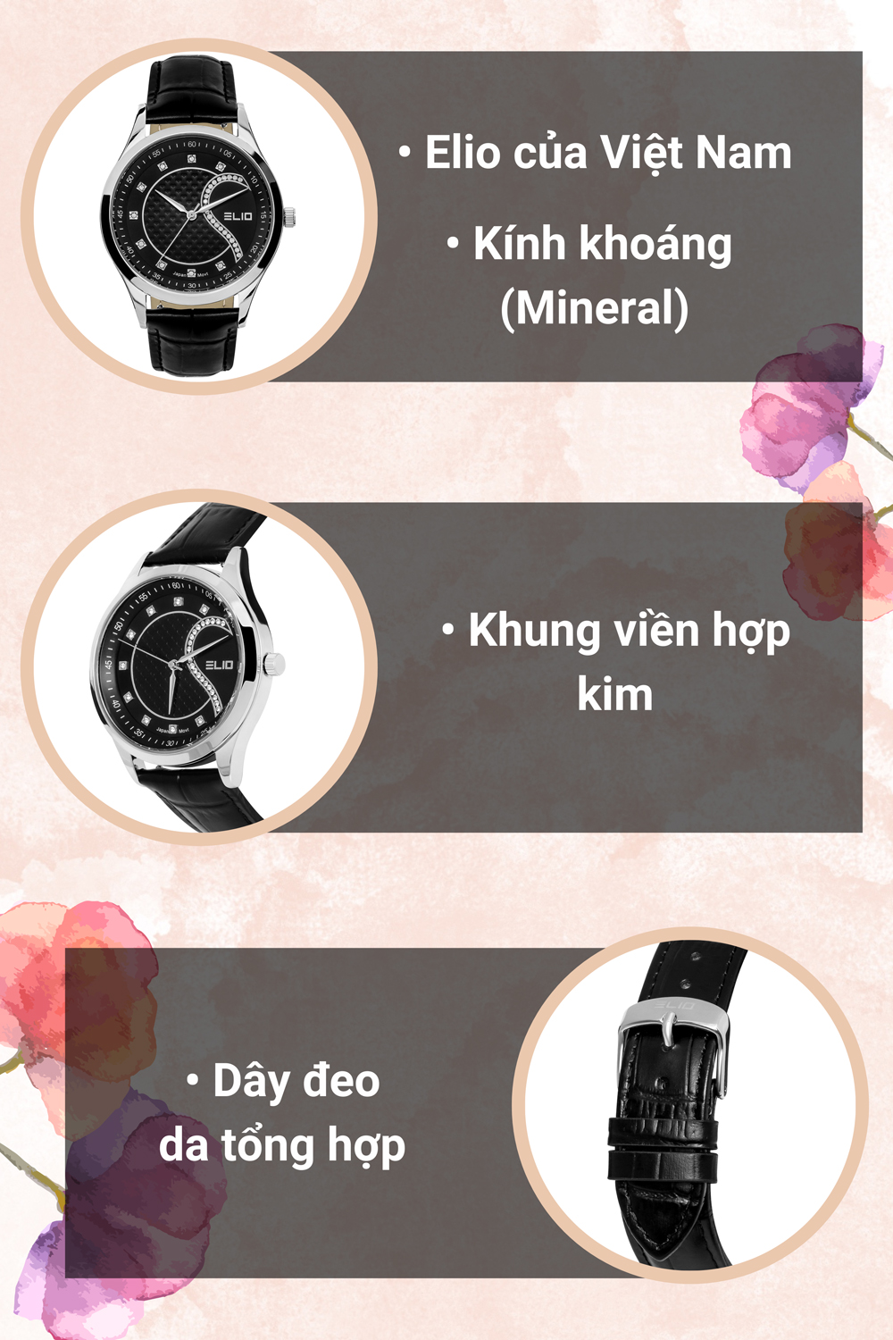 - Đồng hồ Elio với kiểu dáng, mẫu mã năng động, trẻ trung phù hợp với mọi lứa tuổi, đồng thời đồng hồ Elio còn mang vẻ đẹp sang trọng, lịch lãm. Đặc biệt đồng hồ Elio còn sử dụng bộ máy của Nhật Bản với chất lượng và độ bền cao.