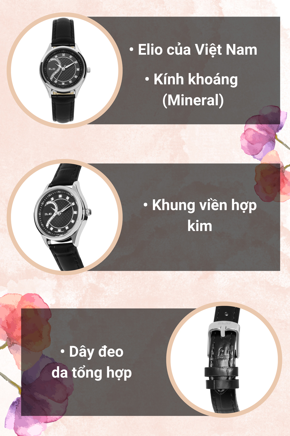- Đồng hồ Elio với kiểu dáng, mẫu mã năng động, trẻ trung phù hợp với mọi lứa tuổi, đồng thời đồng hồ Elio còn mang vẻ đẹp sang trọng, lịch lãm. Đặc biệt đồng hồ Elio còn sử dụng bộ máy của Nhật Bản với chất lượng và độ bền cao.