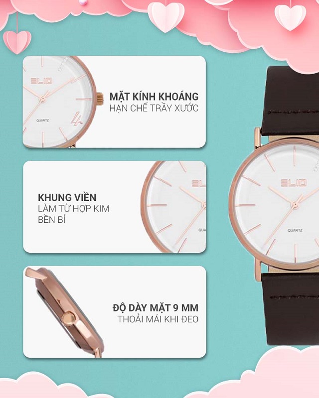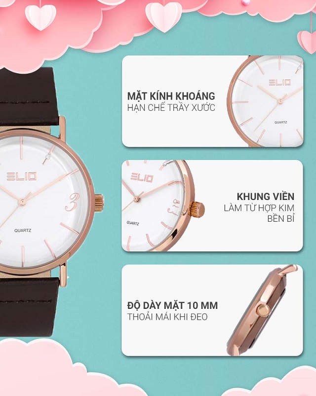 - Đồng hồ Elio với kiểu dáng, mẫu mã năng động, trẻ trung phù hợp với mọi lứa tuổi, đồng thời đồng hồ Elio còn mang vẻ đẹp sang trọng, lịch lãm. Đặc biệt đồng hồ Elio còn sử dụng bộ máy của Nhật Bản với chất lượng và độ bền cao.