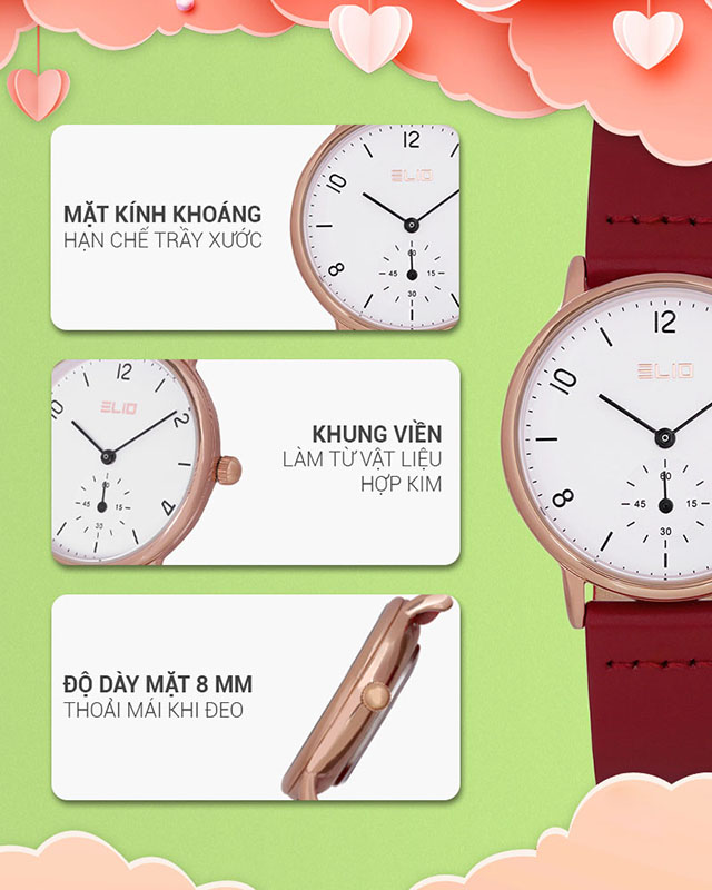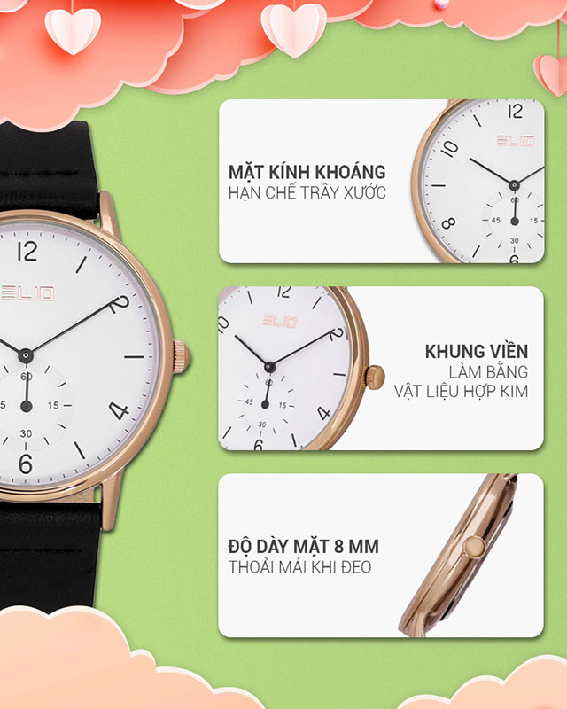 - Đồng hồ Elio với kiểu dáng, mẫu mã năng động, trẻ trung phù hợp với mọi lứa tuổi, đồng thời đồng hồ Elio còn mang vẻ đẹp sang trọng, lịch lãm. Đặc biệt đồng hồ Elio còn sử dụng bộ máy của Nhật Bản với chất lượng và độ bền cao.