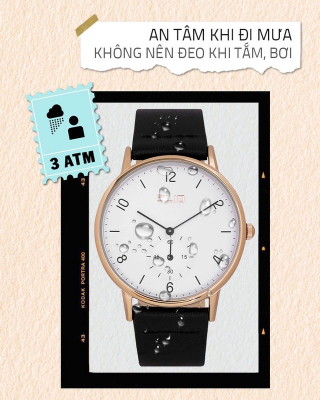 - Chống nước 3 ATM: Đồng hồ vẫn an toàn khi bạn đeo đi mưa, rửa tay, không mang khi tắm, bơi lội, lặn