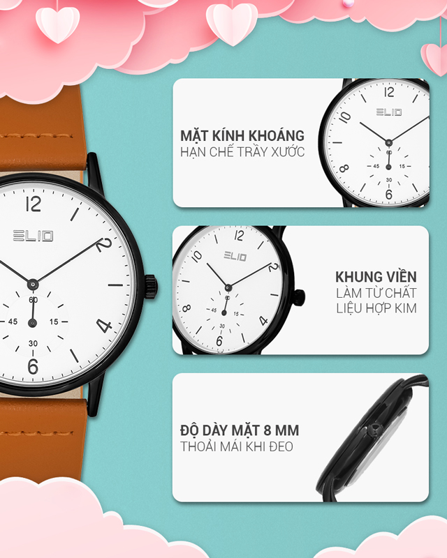 - Đồng hồ Elio với kiểu dáng, mẫu mã năng động, trẻ trung phù hợp với mọi lứa tuổi, đồng thời đồng hồ Elio còn mang vẻ đẹp sang trọng, lịch lãm. Đặc biệt đồng hồ Elio còn sử dụng bộ máy của Nhật Bản với chất lượng và độ bền cao.