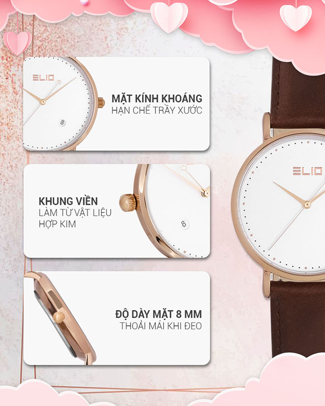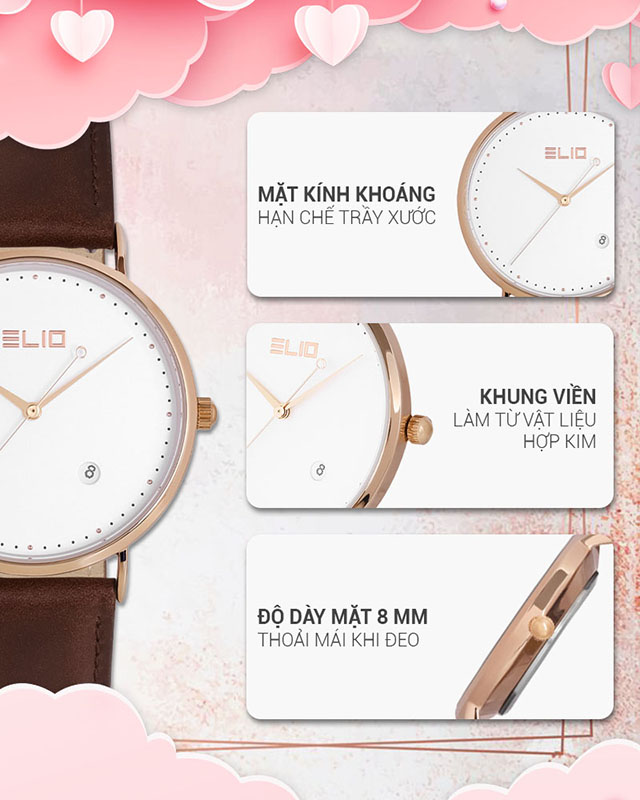 - Đồng hồ Elio với kiểu dáng, mẫu mã năng động, trẻ trung phù hợp với mọi lứa tuổi, đồng thời đồng hồ Elio còn mang vẻ đẹp sang trọng, lịch lãm. Đặc biệt đồng hồ Elio còn sử dụng bộ máy của Nhật Bản với chất lượng và độ bền cao.