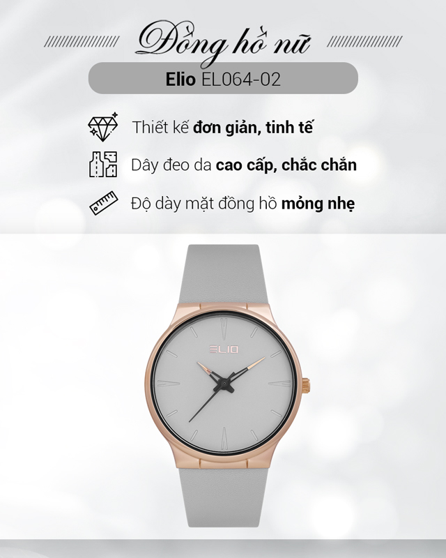 - Đồng hồ ELIO Nắng Xuân 32 mm Nữ EL064-02 có đường kính mặt 32 mm, độ rộng dây 18 mm, phù hợp cổ tay trung bình (chu vi cổ tay dưới 16.5 cm)
